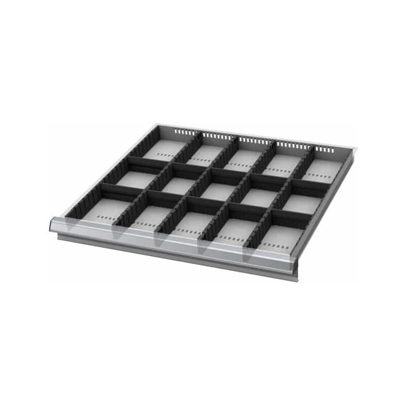 Listelli fessurati laterali, divisori fessurati e separatori lisci ad incastro in plastica. I divisori fessurati vengono fissati con clip nelle fessure del cassetto. I separatori lisci ad incastro vengono inseriti nei divisori fessurati. I divisori riempiono completamente un cassetto 26×24G. Per: Cassetti 26×24G. Contenuto: Set di listelli fessurati laterali n. art. 951580: 1× Dim. 100 Pannelli fessurati n. art. 951530: 4× Dim. 100 Parete divisoria a incastro 5G n. art. 951751: 8× Dim. 100 Parete divisoria a incastro 6G n. art. 951761: 2× Dim. 100 Dati tecnici Attributo del nome del prodotto 26×24G Tipo di prodotto Parete divisoria per cassetti Per altezza frontalini dei cassetti, mm 100 Superficie utile dei cassetti in G 26×24 Per cassetti con larghezza utile in G 26 Per cassetti con profondità utile in G 24 Altezza, mm 75 Peso, kg 1,598 Per cassetti larghezza utile, mm 650 Per cassetti profondità utile, mm 600