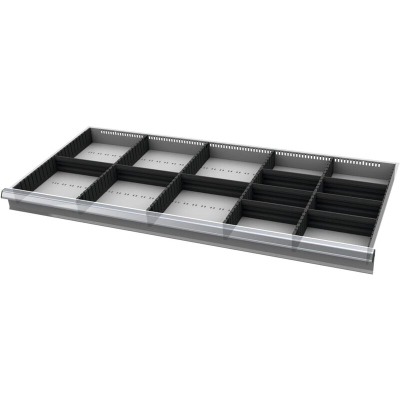 Listelli fessurati laterali, divisori fessurati e separatori lisci ad incastro in plastica. I divisori fessurati vengono fissati con clip nelle fessure del cassetto. I separatori lisci ad incastro vengono inseriti nei divisori fessurati. I divisori riempiono completamente un cassetto 56×24G. Per: Cassetti 56×24G. Contenuto: Set di listelli fessurati laterali n. art. 951580: 1× Dim. 125 Pannelli fessurati n. art. 951530: 4× Dim. 125 Parete divisoria a incastro 10G n. art. 951801: 6× Dim. 125 Parete divisoria a incastro 12G n. art. 951821: 3× Dim. 125 Dati tecnici Attributo del nome del prodotto 56×24G Tipo di prodotto Parete divisoria per cassetti Per altezza frontalini dei cassetti, mm 125 Superficie utile dei cassetti in G 56×24 Per cassetti con larghezza utile in G 56 Per cassetti con profondità utile in G 24 Altezza, mm 100 Peso, kg 2,36 Per cassetti larghezza utile, mm 1.400 Per cassetti profondità utile, mm 600
