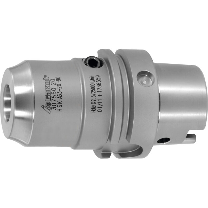 DescrizioneEsecuzione:Resistenza complessiva molto elevata grazie alla struttura ottimizzata.Con fori Balluffchip.Regolazione assiale della lunghezza, corsa di regolazione 10 mm.Flessibile grazie all'impiego di bussole di riduzione.Vantaggi:Massime coppie trasmissibili (550 Nm), pertanto sicurezza di processo. Proprietà di smorzamento ideali, pertanto una superficie del pezzo ottimale, una maggiore durata e nessun rischio di danni al mandrino.Uso:In particolare nella truciolatura pesante durante la fresatura. Per il serraggio di utensili con tolleranza codolo h6.Fornitura:Inclusa chiave esagonale con impugnatura a T.Accessori speciali:Raccordo per lubrorefrigerante n. art. 309880, chiavi a bussola n. art. 309890.Nota:Prestare attenzione in caso di utensili extralunghi e durante la lavorazione TPC.Dati tecnici ⌀ attacco D1 20 mm Adattatore HSK-A 63 corto Norma attacco ISO 12164-1;