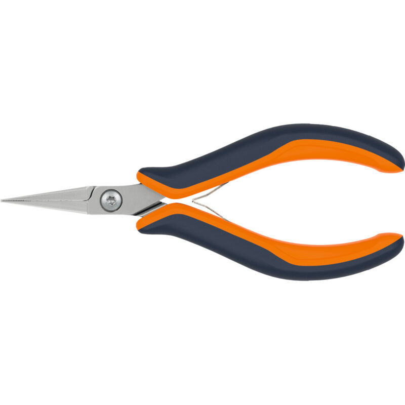 Forma sottile lavorata di precisione. Superficie opaca sabbiata con articolazione passante e vite ribassata. Doppia molla per semplicità di utilizzo. Manici rivestiti in bimateriale conduttivo indicato per ESD. Becchi con superfici di presa a dentatura fine. Materiale: Acciaio speciale per utensili, lavorato su CNC, per tolleranze della massima precisione. Dati tecnici Proprietà elettrostatiche EGB/ESD Tipo di prodotto Pinza a becchi piatti diritti Lunghezza complessiva, mm 140 Larghezza della testa, mm 10 Lunghezza griffe, mm 30