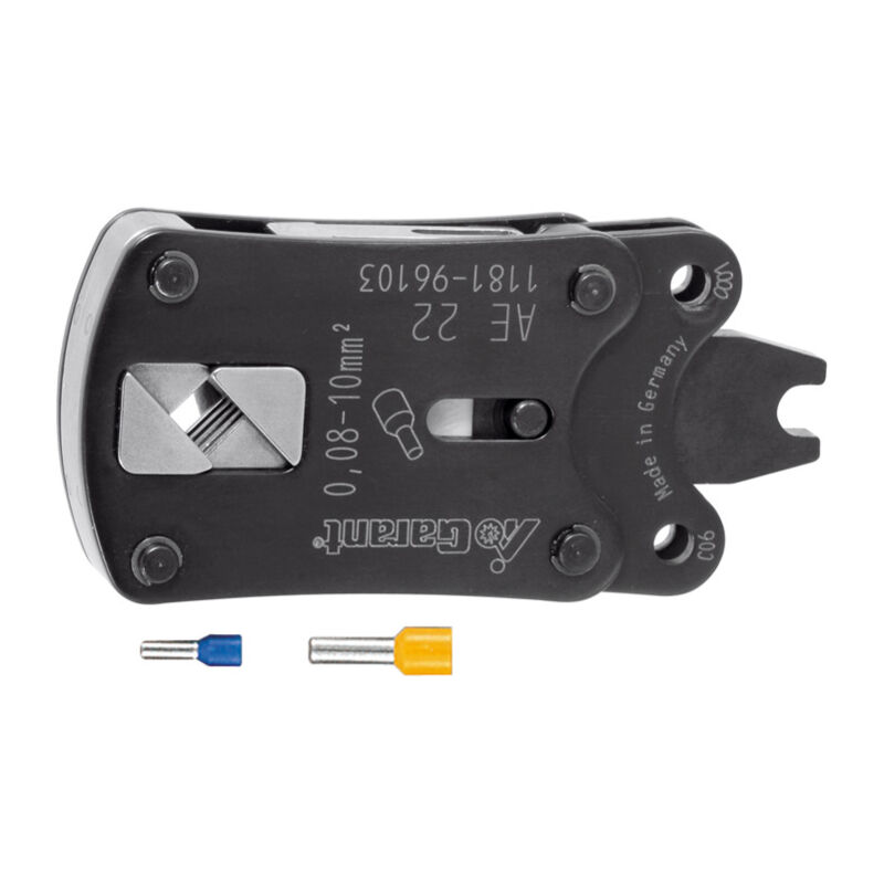 Serraggio parallelo preciso grazie a 4 ganasce sincrone. Serraggio quadro a norma DIN = superfici di contatto ottimali. * Serraggio esatto grazie alla corsa lineare * Maggiori possibilità di impiego a costi ridotti grazie al sistema di cambio rapido senza utensili * Risultati sempre costanti a norma DIN o EN grazie alle testine intercambiabili pretarate e all'arresto forzato incorporato nell'utensile base * Sempre in sede grazie al serraggio sempre perfetto dei contatti * Ideale per lavorare in punti di difficile accesso grazie alla forma piccola e maneggevole. Uso: Per lavorare capicorda. Per: Utensile di base GARANT n. art. 729611. Nota: Altre testine intercambiabili disponibili su richiesta. Dati tecnici Tipo di prodotto Strumento serraggio Per sezione del filo, mm2 0,08 - 10