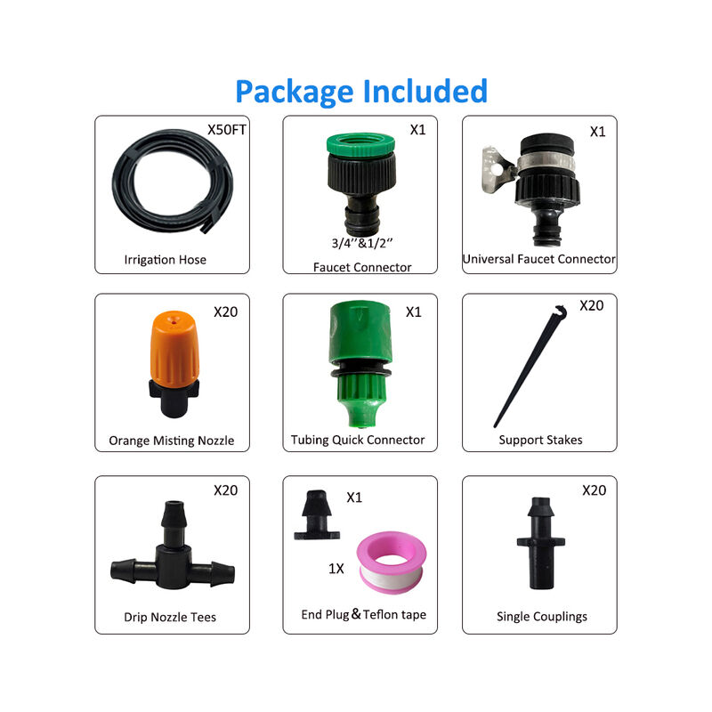 Key Features Flow rate of each mister: 6.7-7 L/Hour, Max spray diameter: 0.3m. Up to 70 percent water savings compared to manual watering.The nozzle has two water outlet modes, columnar and misty, you can adjust the nozzle according to your needs.Precise drip watering for green, healthy plant growth with low water usageThe irrigation tubing is made from high quality, all of the fittings are made from high quality plasticNo longer worried about leaving home for holiday, just add an auto timer (buy separately) to control irrigation kit. irrigation kit is great for agriculture, lawn, garden, patio, greenhouse, swimming pool misting fog cooling irrigation. Package Included 4/7 TubeX15 meters4/7 Quick Connectorx 1pcs1/2 &3/4 Faucet Connectorx1pcsUniversal Connectorx1pcsOrange Misting Nozzlex20pcs4/7 support stemsx20pcs4/7 Barbed Teex20pcs4/7 End Plugx1pcsTelon Tapex1pcs4/7 single Barbx20pcspackingx1pcs Product Details