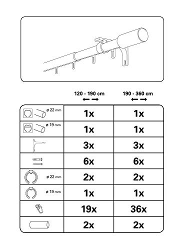 Elegante set completo composto da bastone per tende estensibile (Ø 22/19 mm), 3 supporti in metallo, 2 terminali e 19 anelli, Materiale di fissaggio incluso