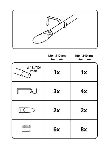 Elegante set completo composto da un'asta per tende estensibile (Ø 16/19 mm), 3 supporti con base in metallo (lunghezza 8 cm) e terminali in metallo, Incluso tutto il materiale di montaggio, Terminali e anelli per tende disponibili separatamente