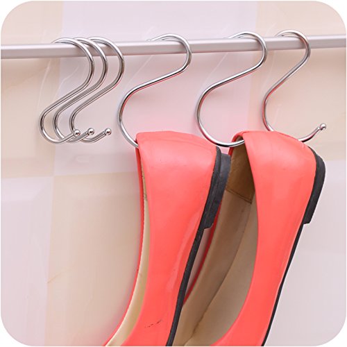 10 garfios en forma de S de acero inoxidable. Perchas rematadas en bola para cucharas, sartenes, cazos, zapatos, bolsas o toallas. Para la cocina, el armario, la oficina, el taller o el garaje.