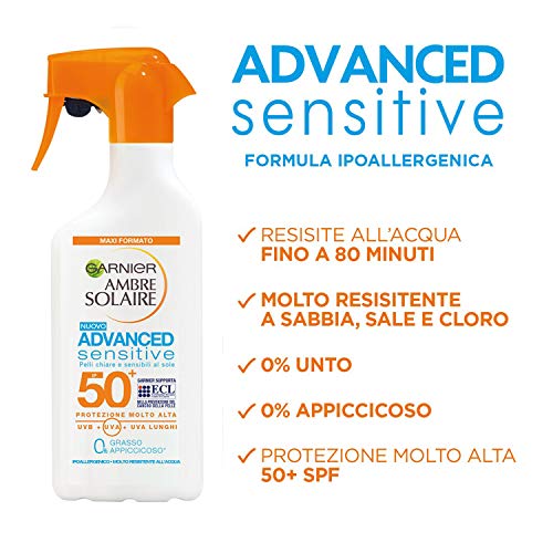 Garnier Ambre Solaire Spray Gachette Protettivo IP 50+ Advanced Sensitive, Protezione Molto Alta, Maxi Formato, 300 ml