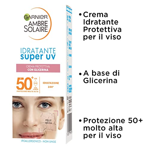 Contenuto: 1x Garnier Crema Viso Protettiva Idratante Super UV, Per Pelli Secche, Protezione SPF 50+, Ad Assorbimento Rapido, Con Glicerina, Ambre Solaire, 50 ml
