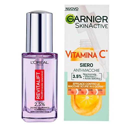 Garnier Skinactive Siero Viso Concentrato con Vitamina C Illuminante e Anti Macchie da 30ml + Revitalift Filler Siero Anti Rughe Contorno Occhi con Acido Ialuronico e Caffeina da 20ml