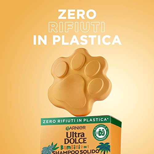 Garnier Ultra Dolce Shampoo Solido 2in1 per Bambini, Albicocca e Fiori di Cotone Re Leone, Packaging 100% Senza Plastica, 60 g