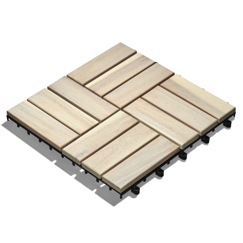 Piastrelle per terrazze in legno di acacia certificato FSC, set da 10 pezzi (circa 0,9 m²). circa 30 x 30 x 2,4 cm (lunghezza x larghezza x altezza), facile da posare grazie al meccanismo a incastro in plastica sul fondo. Per un ambiente di benessere sulla terrazza, sul balcone o nel giardino d'inverno. Utilizzabile anche come percorso. Nessun accumulo di acqua grazie al sistema di drenaggio. Dimensioni delle piastrelle: circa 30 x 30 cm. Materiale: legno di acacia. Antiscivolo, non si scheggia e non si crepa, resistente agli insetti, non richiede pretrattamento, alta capacità di carico. Ambiente di benessere: con le piastrelle potrete creare un'oasi di benessere sulla terrazza, sul balcone o sul giardino d'inverno. E questo è facile da posare grazie al sistema Click! Non è necessario praticare fori o viti. Il legno di acacia convince per la sua lunga durata senza una grande manutenzione. Posizionamento: facile da installare grazie al meccanismo a incastro in plastica sul fondo. Le