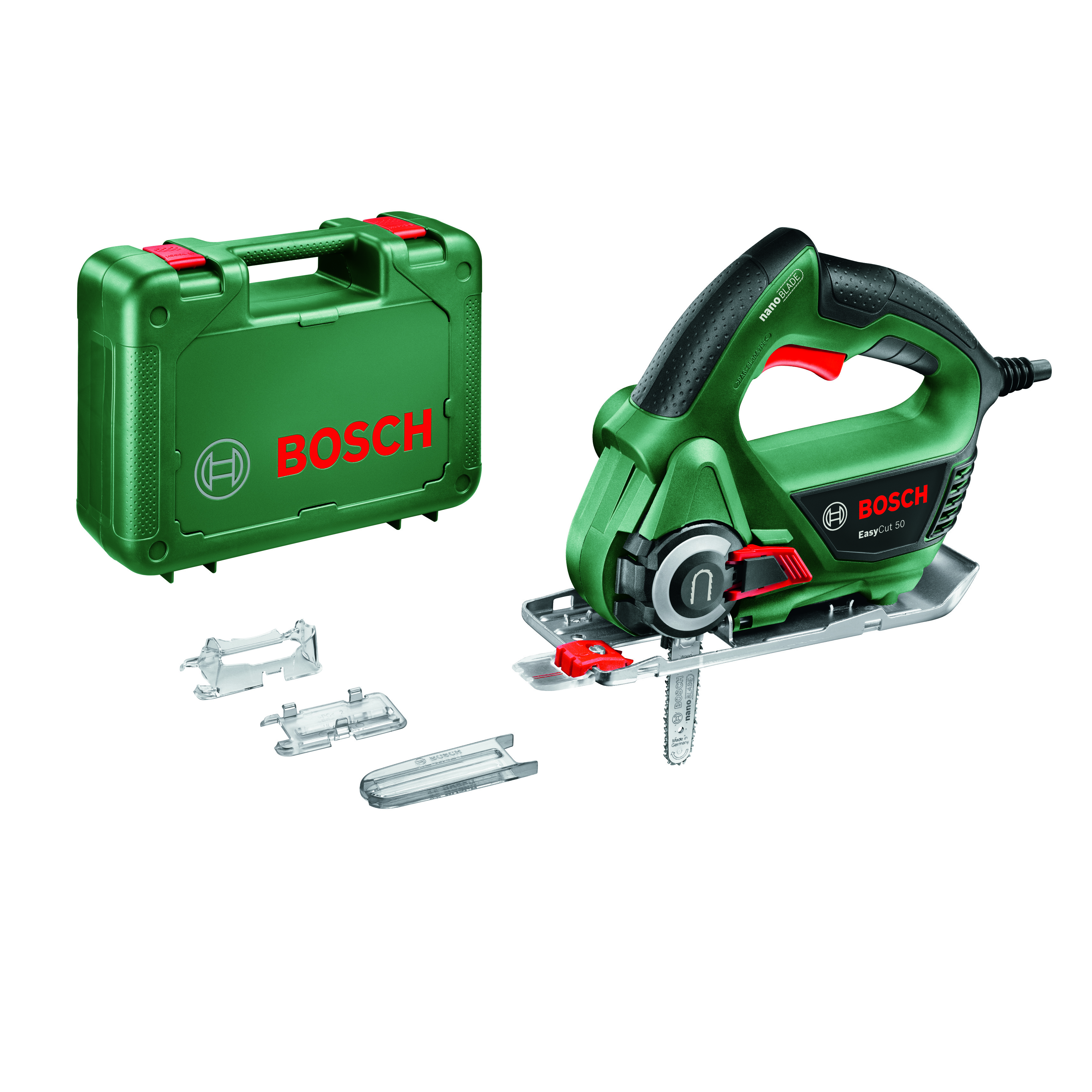 è inoltre possibile collegare un aspiratore esterno per mantenere pulita e libera l'area di lavoro.. EasyCut 50 è la scelta ideale per eseguire tagli ortogonali precisi nel legno (50 mm) e in materiale plastico (30 mm). Sfruttate la regolazione elettronica Bosch per ottenere i migliori risultati: premendo l'apposito pulsante, disporrete della velocità desiderata per ogni tipo di applicazione e materiale.. La microlama NanoBlade non necessita di manutenzione, non richiede oliature né affilature e la sostituzione è molto semplice: lè alloggiata in uno sportello che da aperto ne permette una facile rimozione, mentre da chiuso garantisce il serraggio automatico nella posizione corretta.. Localizzato nella parte anteriore dell'utensile, il sistema CutControl estraibile consente di seguire agevolmente la linea di taglio precedentemente segnata.