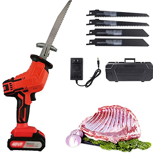 【BATTERIA AL LITIO 48V】 La sega per carne è alimentata da una batteria al litio ricaricabile da 48 V, che fornisce un tempo di funzionamento più lungo e più potenza, la segaossa elettrica ha doppie garanzie di sicurezza (interruttore di protezione/interruttore di avviamento), cambi di velocità con la pressione e ricambia a Taglio ad alta frequenza, funzionamento duraturo e stabile.