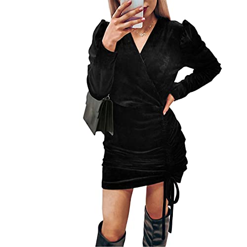 Geagodelia Abito da Sera Donna Vestito in Velluto Cerimonia a Maniche Lunghe Scollo a V Abito Tubino Elegante e Raffinata S-XL Festa Matrimonio (Nero, Small)