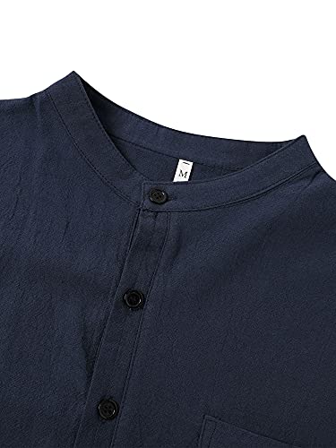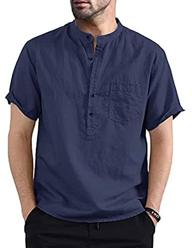 Geagodelia Camicia da Uomo Collo Henley in Cotone a Maniche Corte Confortevole alla Moda a Tinta Unita con Tasca e Bottoni Moderna Casual Estiva (Blu, XL)