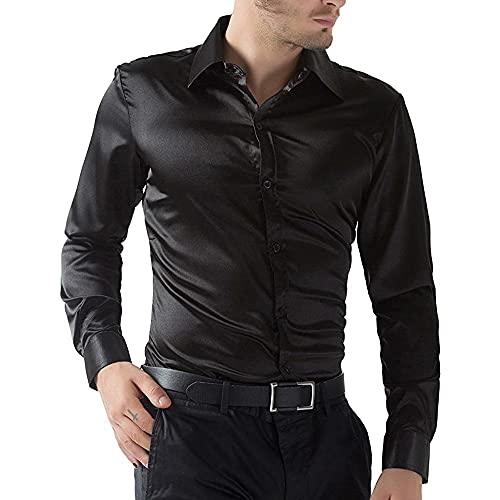 Geagodelia Camicia Uomo Formale Slim Fit S-XXL Camicetta Formale in Seta Lucida Brillante in Tinta Unita Camicia da Lavoro Camicia Uomo Elegante Cerimonia (Nero, X-Large)
