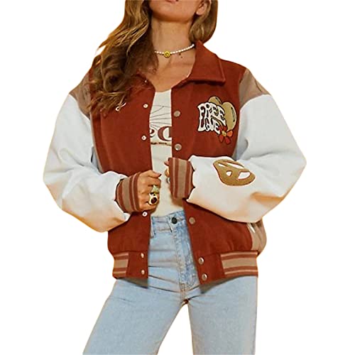 Geagodelia Giacca da Donna Giacca Casual con Ricamo a Lettera a Maniche Lunghe Giacche da Baseball alla Moda Hip-Hop Oversize per Autunno Primavera (Arancione, XL)