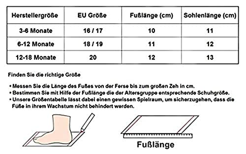 Taglia: 0-6 mesi (lunghezza della suola: 11 cm), 6-12 mesi (lunghezza della suola: 12 cm), 12-18 mesi (lunghezza della suola: 13 cm).