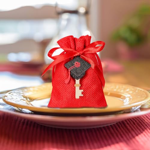 GEBETTER 20pz Sacchetti Iuta Bomboniere Laurea Sachetti Rossi Porta confetti Laurea+20pz Ciondoli Portafortuna Cappello di Laurea Coccinella+1 Rotolo Nastro Addobbi Festa Laurea Regalo