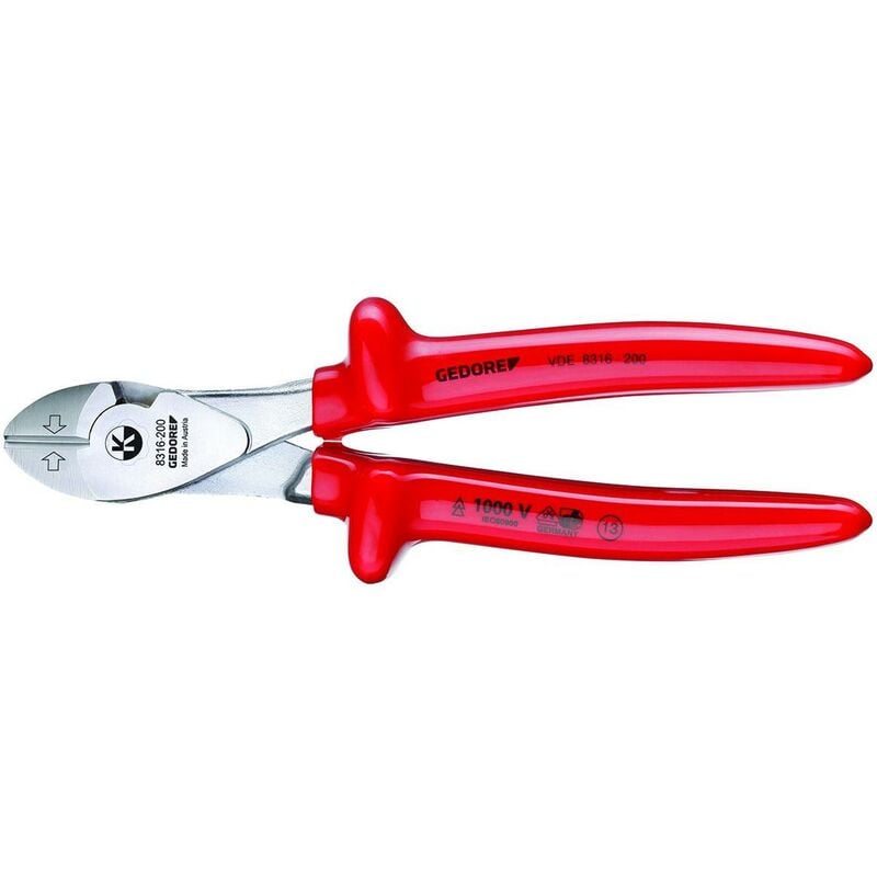 Taglienti di precisione temprati a induzione, durezza 63 - 65 HRC, Per filo duro/filo armonico - vedere tabella, Capacità di taglio max. Ø 1,8 - 2,0 mm, Acciaio speciale da bonifica GEDORE, cromato, Bracci con rivestimento isolante VDE sec. EN 60900/IEC 60900, doppio isolamento Check-Tool, Bracci con isolamento VDE fino a 1000 V secondo EN 60900/IEC 60900, con isolamento a immersione: Doppio isolamento Check-Tool
