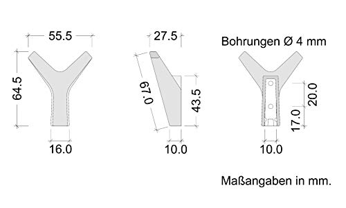 2 ganci per cappotto rettangolari con altezza totale: 65 mm - Larghezza: 58 mm - Distanza tra i fori: 20 mm - Profondità: 27 mm - Spessore materiale: 10 mm - Diametro viti: 4 mm