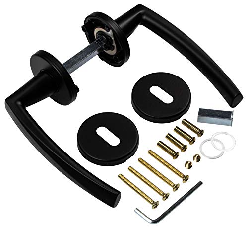 Contenuto della confezione: 1 set per porta a forma di L con coppia di maniglie e rosette di colore nero opaco con perno a pressione, manicotti di compensazione, viti per vermi e materiale di fissaggio