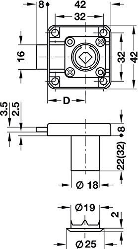 Scatola serratura con apertura: 25 mm - Ø cilindro: 19 mm - Lunghezza cilindro: 22 mm - Scatola serratura: 42 x 42 mm