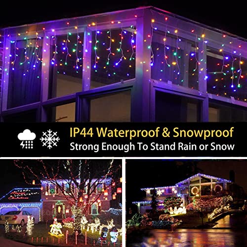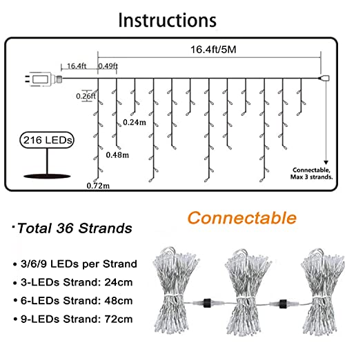 ✔ 5M 216 LED Luci Cascata - Luci natale esterno cascata colorate, lunghezza totale circa 10 m (di cui 5 m di cavo), cavo trasparente. Le luci natale esterno sono collegabili, max 3. Alimentata con EU adattatore.
