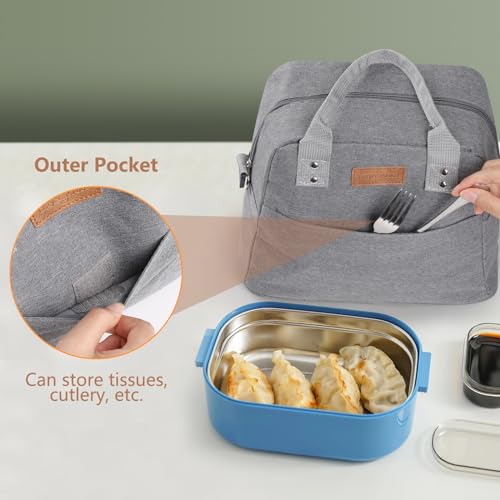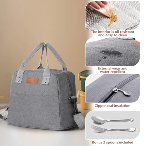 GeeRic 7.5L Borsa Termica+Forchetta+Cucchiaio con Tracolla Regolabile Impermeabile Prova Perdita Riutilizzabile Borsa Frigo Porta Pranzo Organizzatore per Picnic Scuola Ufficio Adulto Bambini Grigio