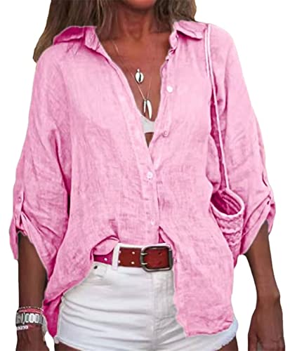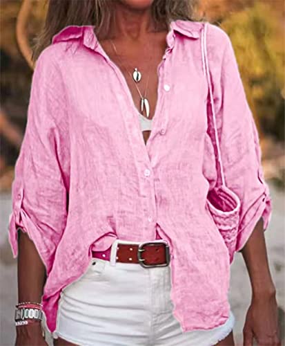 Gellmall Donna Camicetta in Lino Cotone Camicie 3/4 Maniche con Bottoni Tunica Solidi con Risvolto Blouse Casual Larghe Top S