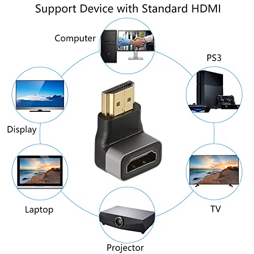 Adattatore HDMI a 90 gradi: gli adattatori HDMI angolati evitano di piegare i cavi HDMI e alleviano la tensione sulle porte HDMI. È la soluzione ideale per spazi ristretti come dietro la TV montata a parete. In base all'orientamento della porta HDMI sul dispositivo, guidare il cavo verso l'alto o verso il basso per evitare il rischio di piegarsi quotidianamente.