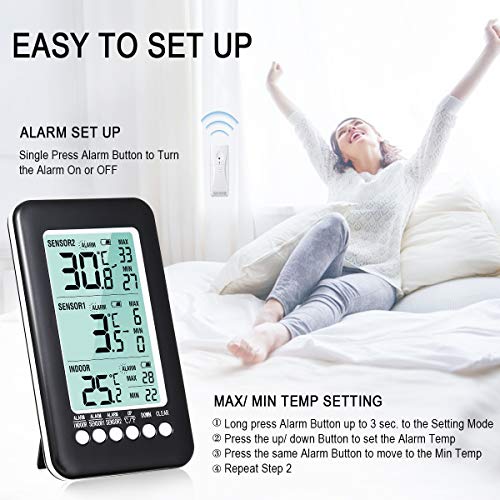 GEMITTO Termometro ad Alta Precisione Casa Digitale Funzione di Allarme, Termometro Digitale con Minima e Massima con 2 Sensori Extra Supporto Appeso Hole 15 x 8,6 x 2,1cm Nero