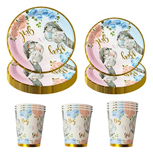 Gender Reveal Party Decoration, 30 Pezzi Baby Shower Decorations Elefante, Rorchio Gender Reveal Party Piatti Stoviglie, Bicchieri di Carta, Kit Compleanno Fiore di Elefante, per Benvenuto Neonato