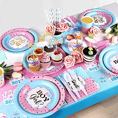Gender Reveal Party Piatti, 64 Pezzi Boy or Girl Stoviglie, Baby Shower, Stoviglie per Feste con Bicchieri di Carta, Tovaglioli di Carta, Piatti, Serve 16 Ospiti