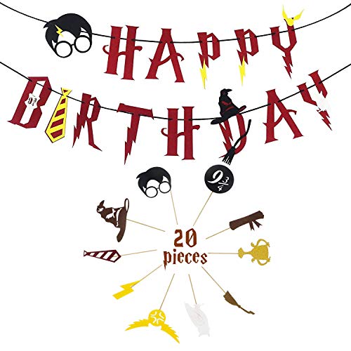 ☆Decorazioni di compleanno di Harry Potter: il pacchetto include 1 striscione di buon compleanno di Harry Potter, 20 toppers di cupcake di Harry Potter.