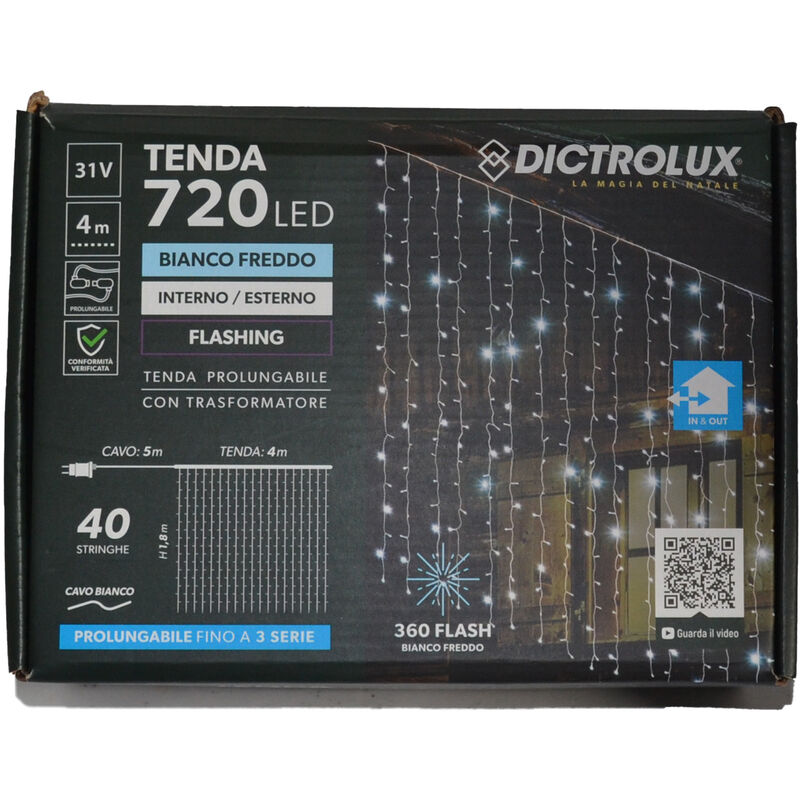 Tenda led - Marca Dictrolux - Prolungabile - Flashing - Cavo bianco - 720 Led - Interno esterno - Bianco freddo Tenda Dictrolux 720 Led tenda prolungabile con trasformatore per uso interno ed esterno, con cavo bianco, effetto flashing con 360 flash. Colore bianco freddo, 720 led. Lunghezza con cavo 9 metri. Lunghezza tenda 4 metri. 40 strighe di luci, lunghezza stringhe 1.8 metri.