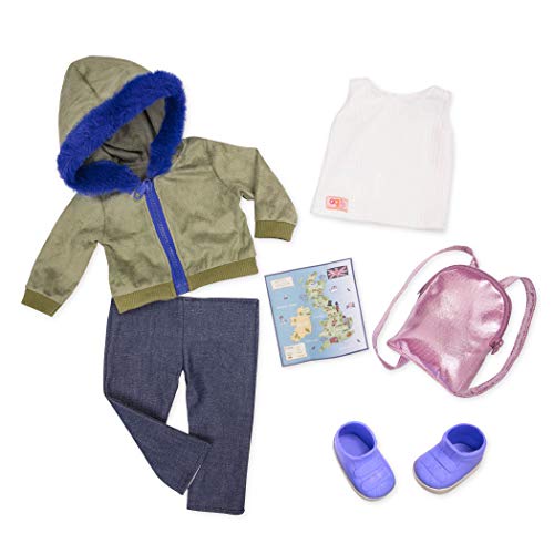 Scopri questo set di abbigliamento Deluxe con una giacca kaki e blu della marca Our Generation
