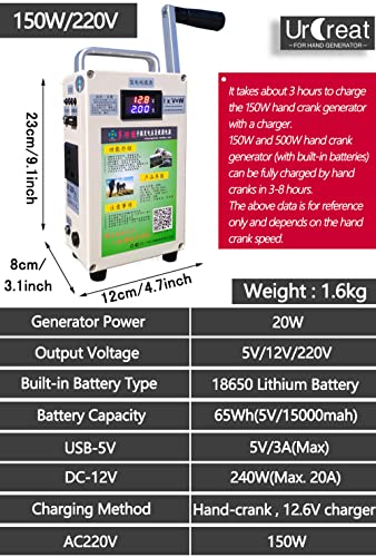 【150 W Generatore】: portatile generatore a manovella da 150 W con un design innovativo, solo 1,6 kg di peso, portatile e facile da usare. Questo generatore di corrente a manovella con presa USB(5V)/AC220V/12V, può soddisfare le tue diverse esigenze.
