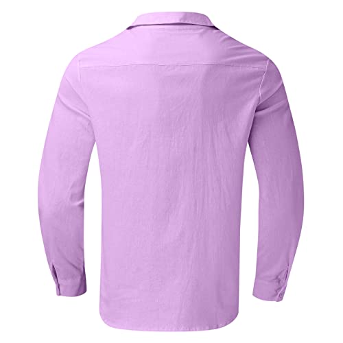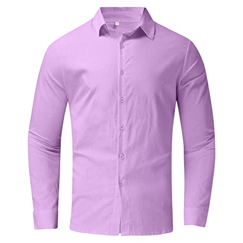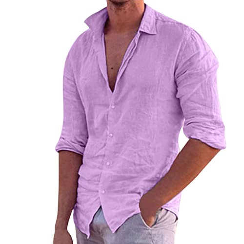 Generic Camicia estiva da uomo in cotone e lino, tinta unita, con colletto rovesciato, a maniche lunghe, da uomo, Lilla, XL