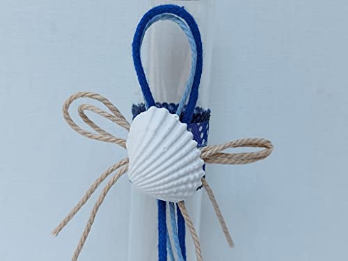 Materiale: Vetro trasparente e senza imperfezioni con applicazioni in legno tema mare con ancora, stella, conchiglia e timone. Colori Bianco e BLU