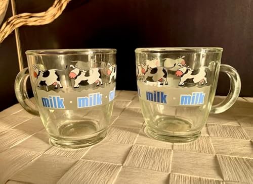Generico Set 2 mug vetro trasparente ideali per latte, cappuccino, the, infusi, caffe' lungo, con decoro mucca e scritta milk