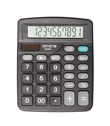 Genie Calcolatrice da tavolo 220 MD a 10 cifre, Dual Power (solare e batteria), 1 pezzo, design compatto, nero