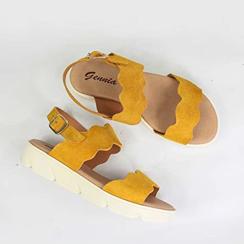 GENNIA JULIA - Sandali piatti da donna in pelle con suola robusta bianca e onde a zigzag - Chiusura con fibbia - Suola flessibile antiscivolo - Soletta imbottita - Made in Spain - giallo 39 EU