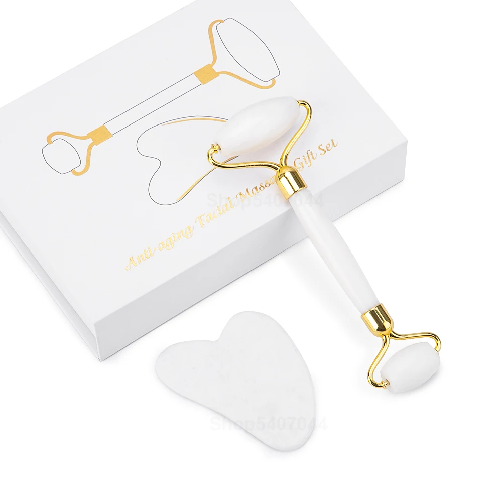 Genuine Jade Stone Massage Natural Quartz Scraper Jade Roller Gua sha Set White Face Lifting Facial Massager Tool for Back Neck