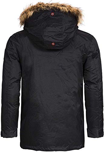 Dettagli: giacca invernale da uomo, antivento, impermeabile, resistente al freddo, traspirante, taglio dritto, colletto alto protettivo con coulisse, cappuccio regolabile con pelliccia sintetica rimovibile (finta pelliccia), ricamo sul petto, etichetta in PVC sulla manica, 3 tasche frontali, polso regolabile, 2 tasche interne con chiusura in velcro, ovatta. varie applicazioni per etichette. Lavorazione di alta qualità