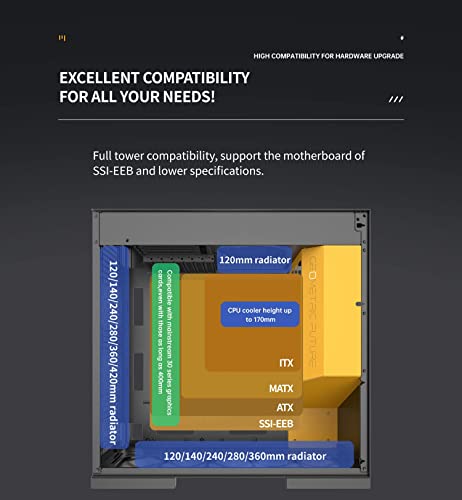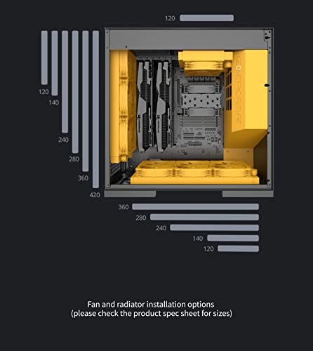 【Eccellente dissipazione del calore】 Supporto per radiatori multipli: supporto rad 120 mm superiore, rad 360 mm inferiore, rad 420/360 mm posteriore. Il raffreddamento ad aria supporta fino a 7 ventole da 120 mm
