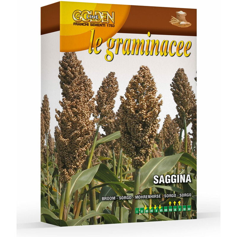 La pianta di Saggina (Sorghum vulgare) è una graminacea annuale ad alto fusto, che sviluppa foglie piatte e lunghe, con infiorescenze all'apice di colore rosso. Utilizzata sia per uso alimentare zootecnico, che per la fabbricazione delle tipiche scope. Semente in scatola gr 100