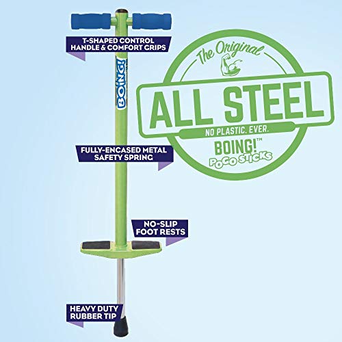 LE SPECIFICHE - Il Jumparoo BOING! JR Pogo è alto 92 cm, la lunghezza del manico per maneggiare è di 25,5 cm, e i pioli hanno uno spazio ampio di 10 cm di larghezza del piede su ciascun lato dell'albero pogo per offrire ai bambini un'esperienza confortevole e sicura. Il colore è verde, disponibile anche in viola;