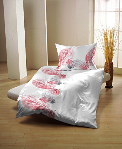 Gerald Wittmann Set Copripiumino Seersucker, 100% Cotone, Biancheria da Letto Singolo, Foglie, Bianco Rosso, 140x200 cm + 70x90 cm