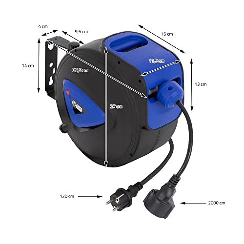 ECD Germany Avvolgicavo Automatico Elettrico Cavo Prolunga 20 m + Cavo Alimentazione 1,2 m con Staffa per Montaggio a Parete Muro Ruotabile di 180° Avvolgitubo Classe di Protezione IP20 Blu e Nero