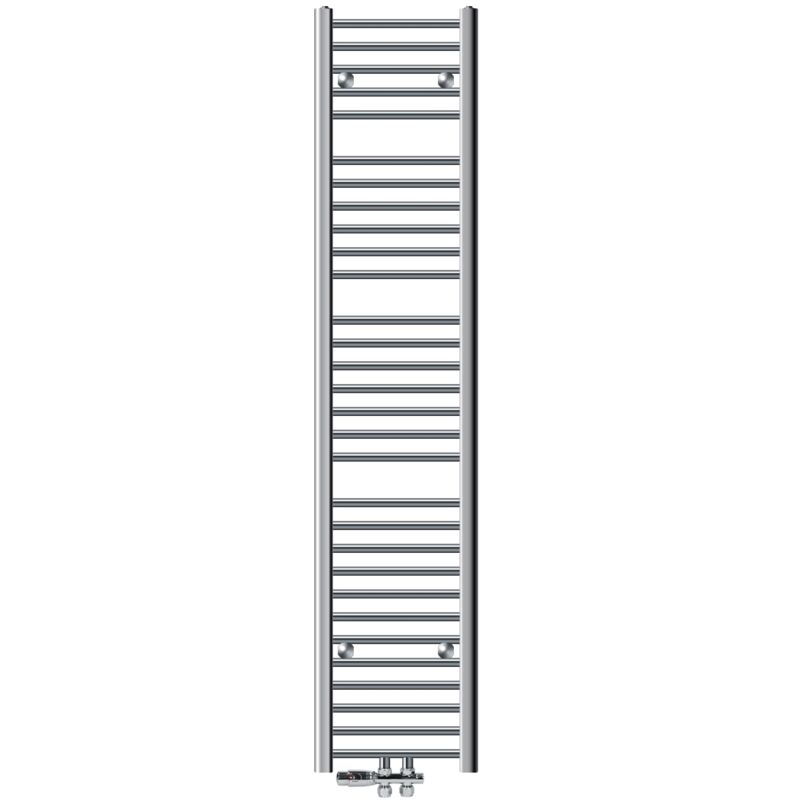 Contenuto: Radiatore da bagno 300 x 1800 mm cromato dritto Valvola di sfiato 1/2 pollice Tappo cieco da 1/2 pollice Termostato con kit di collegamento centrale (collegamento a pavimento / (versione a foro passante) - se i tubi escono dal pavimento) Set di montaggio a parete: 4 x staffe a parete 4 x viti e tasselli 4 viti di fissaggio 4 x dischi Informazioni tecniche: Larghezza (mm): 300 Altezza (mm): 1800 Attacchi (mm): 255 Diametro tubo: Ø22 Profilo (mm): 30 * 40 * 1.5D Potenza termica (watt a 75/65/20 °) Chrom DT50: 367 Quantità di acqua (L): 5,57 Peso (kg): 8,47 pressione massima di esercizio: 10 bar (1 MPa) Pressione di prova: 12 bar (1.2 MPa) profili a D verticali 30 x 40 x 1,5 mm tubi tondi orizzontali 22 x 1,2 mm Distanza dal muro: circa 6,5 ??cm Lunga durata grazie alla cromatura dura radiatore da bagno di alta qualità da un rivenditore specializzato materiale di base spesso robusto imballaggio in cartone Set di connessione: per collegamento centrale con interasse 50 mm